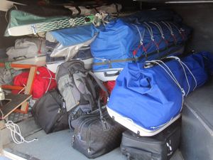 Eikä siinä kaikki: Välineitä täydentävät sähköputkesta ja letkunkiristimistä kehitetyt ”paikkasarjat” aisarikon varalle. Arvelen, etteivät nämä muotojäykät hiihtosauvat katkeile, mutta muutaman kymmenen gramman lisäpaino vain keventää mieltä: Saattaahan sillä voida pelastaa jonkun toisen vaeltajan retken. Muista oma pieni ruuvimeisseli / kiintoavain letkunkiristintä varten.